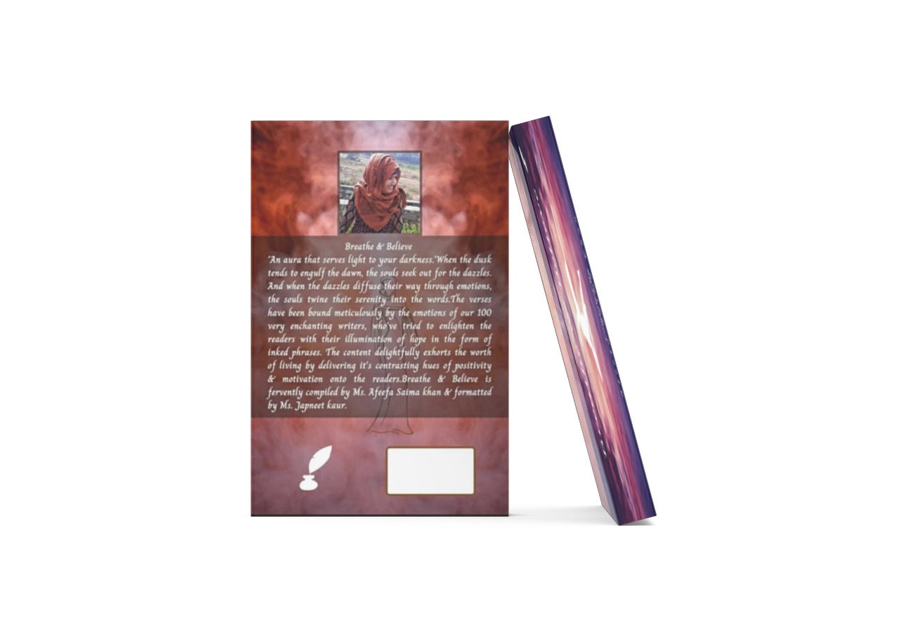 The content delightfully exhorts the worth of living by delivering its contrasting hues of positivity & motivation onto the readers. Breathe & Believe is fervently compiled by Ms. Afeefa Saima Khan & formatted by Ms. Japneet Kaur.